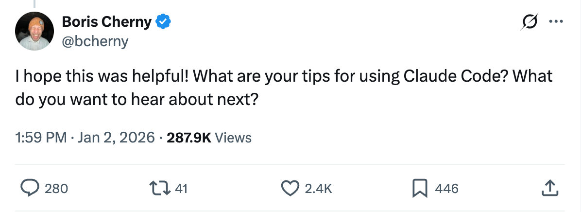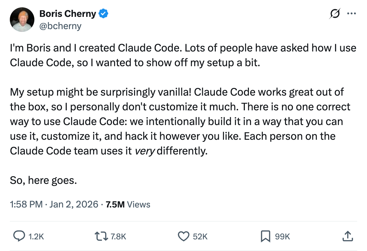 Boris Cherny, the creator of Claude Code, came to my rescue. He posted a great 15-tweet thread about how he personally uses Claude Code. Unlike the rest of us, though, Cherny is using Claude Code to actually write Claude Code. You can see the thread here on Twitter, or here on Threadreader.