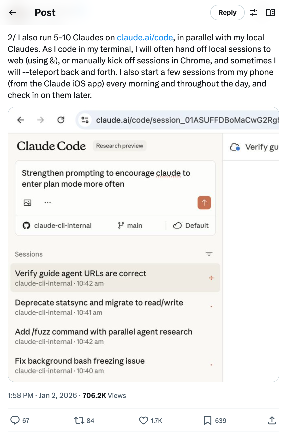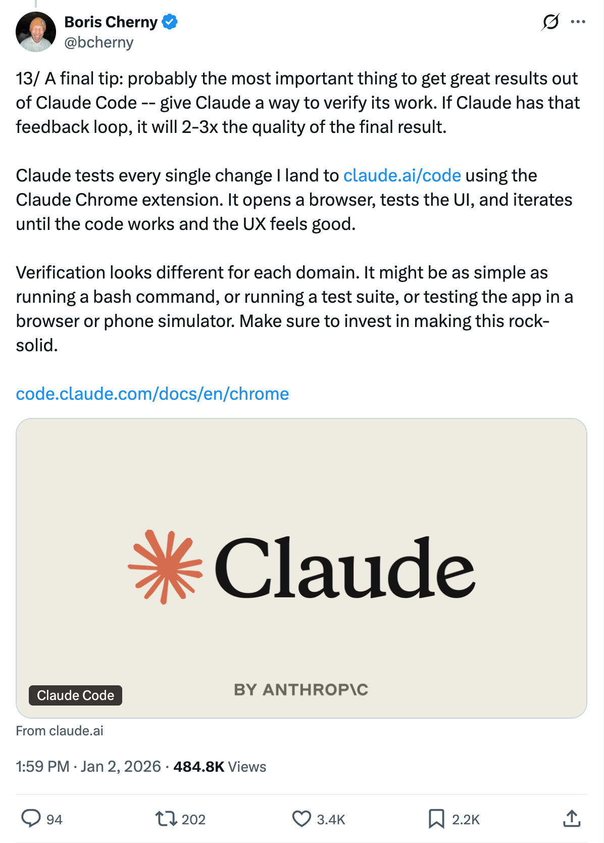 Give Claude a way to verify its work. 2-3x quality improvement. YES.Dive in on getting to “verifiable code” with current projects. Start using it on foreground CC sessions as well as Claude Code web background and long-running Wiggum-type sessions