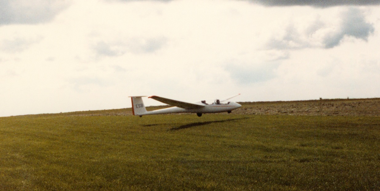 So we walked out onto the field and I soon realized that the Yorkshire Gliding Club was in a whole different league from the Mansfield, Ohio club where I had learned. Sutton Bank’s high cliffs face directly into the prevailing westerly winds, generating fantastic ridge soaring conditions: with even a moderate west wind, glider pilots can soar aloft for hours at a time. The Club’s flying machines were as world-class as its location: sleek, glossy white, state-of-the-art craft built of fiberglass, a far cry from the chunky fabric-and-dented-aluminum 2-33 trainers I had cut my teeth on. Still, I assumed that these gorgeous white rocket ships belonged to well-heeled private owners, and that they’d wheel out something more like the 2-33 for £20 demo rides.