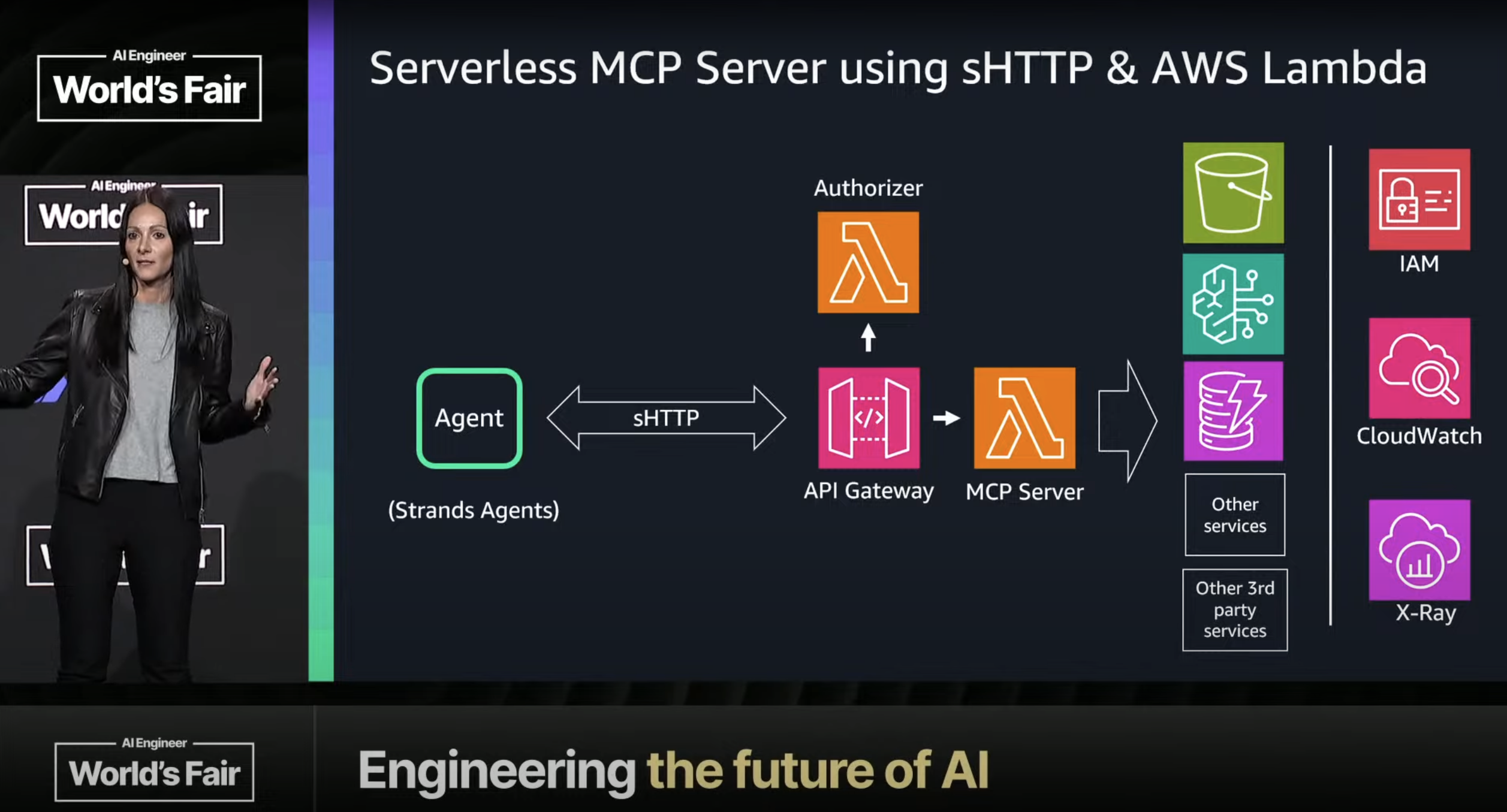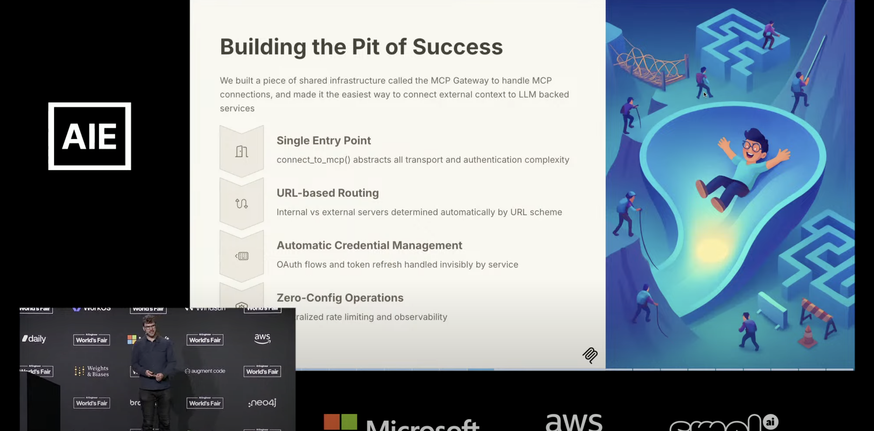 Cloudflare usage was really interesting: “We used a lot of Cloudflare tech … shim up a thing on Workers, they have an OAuth proxy …” explaining “we didn’t have websocket infrastructure internally, but the MCP protocol requires it … problem solved …” Super valuable session.