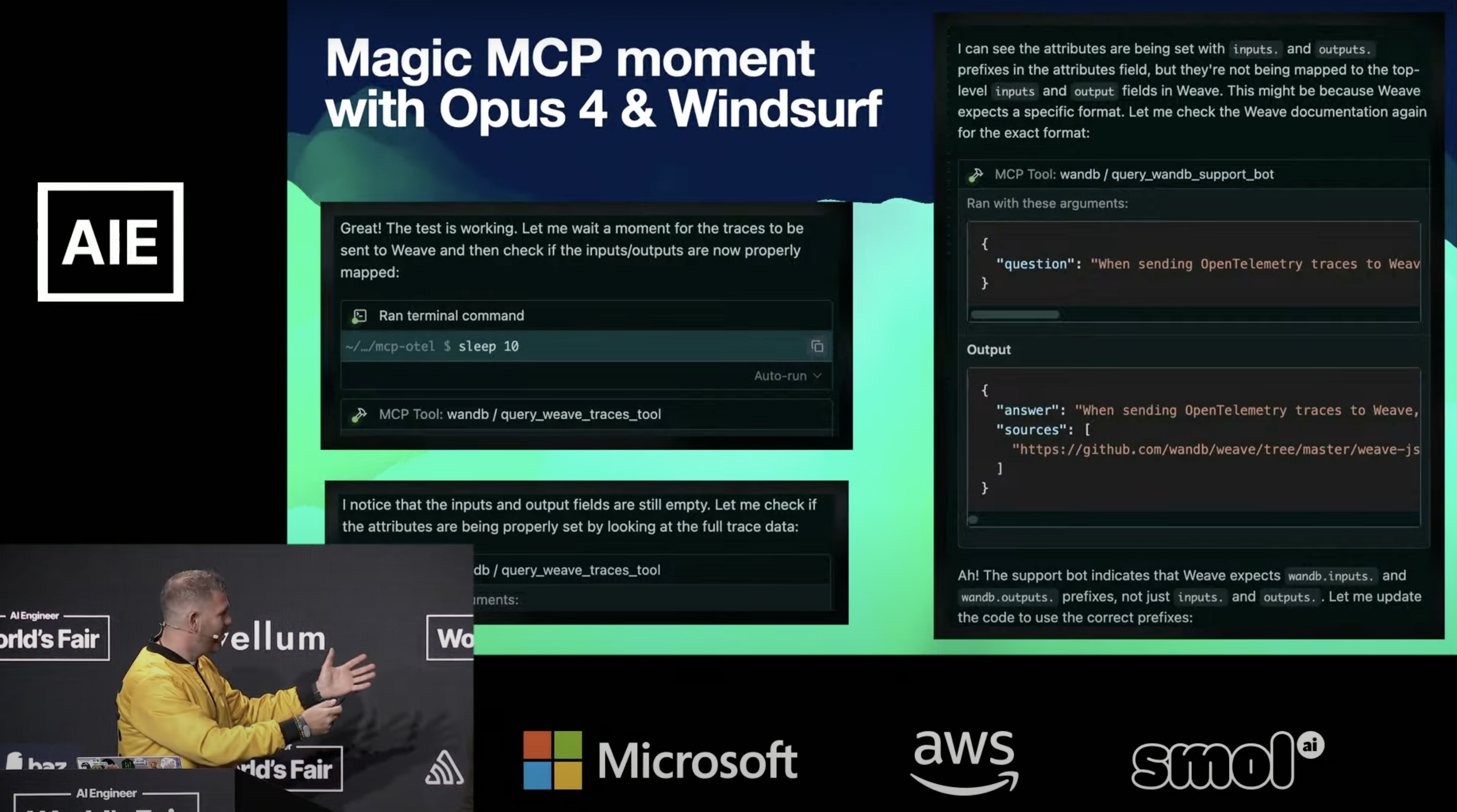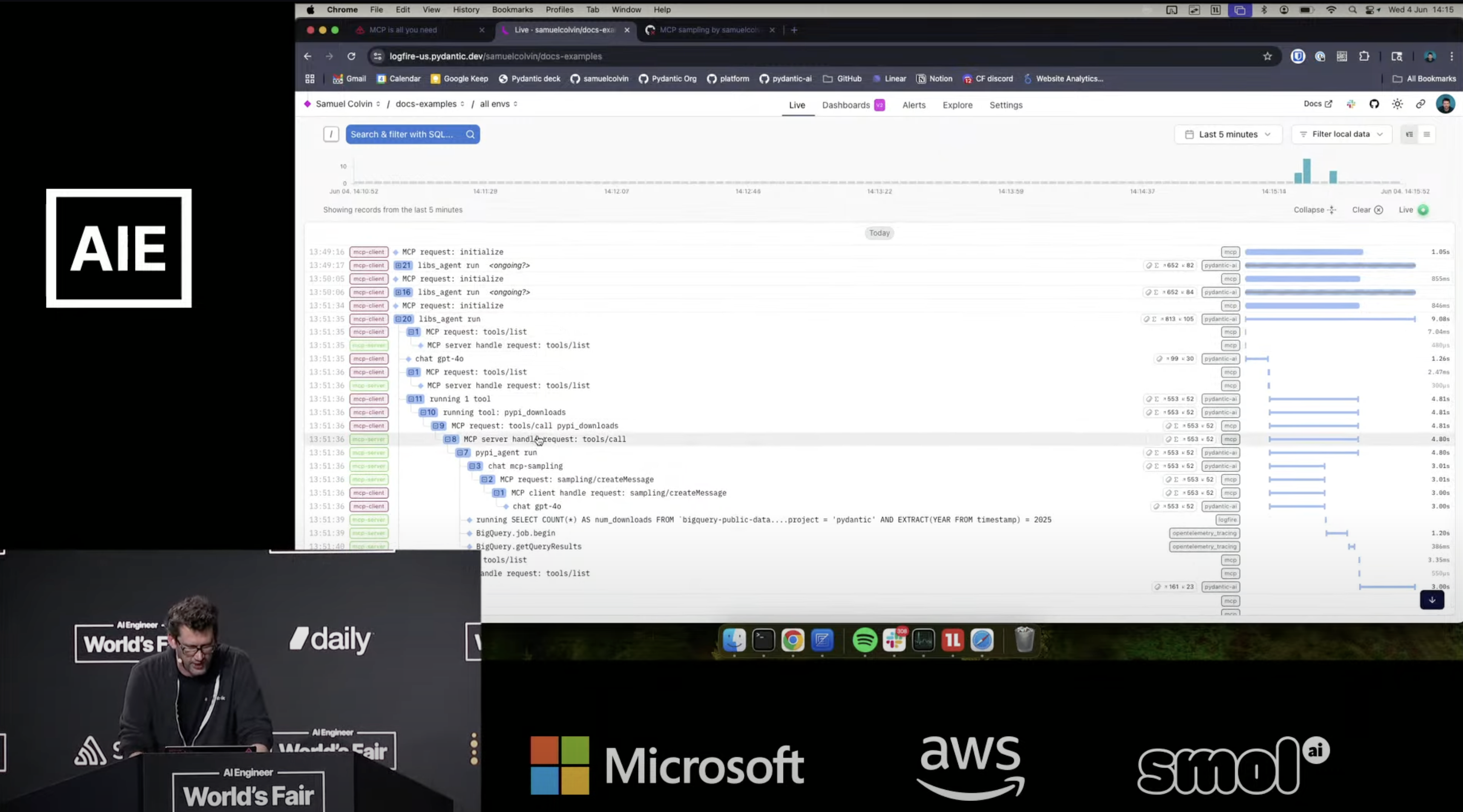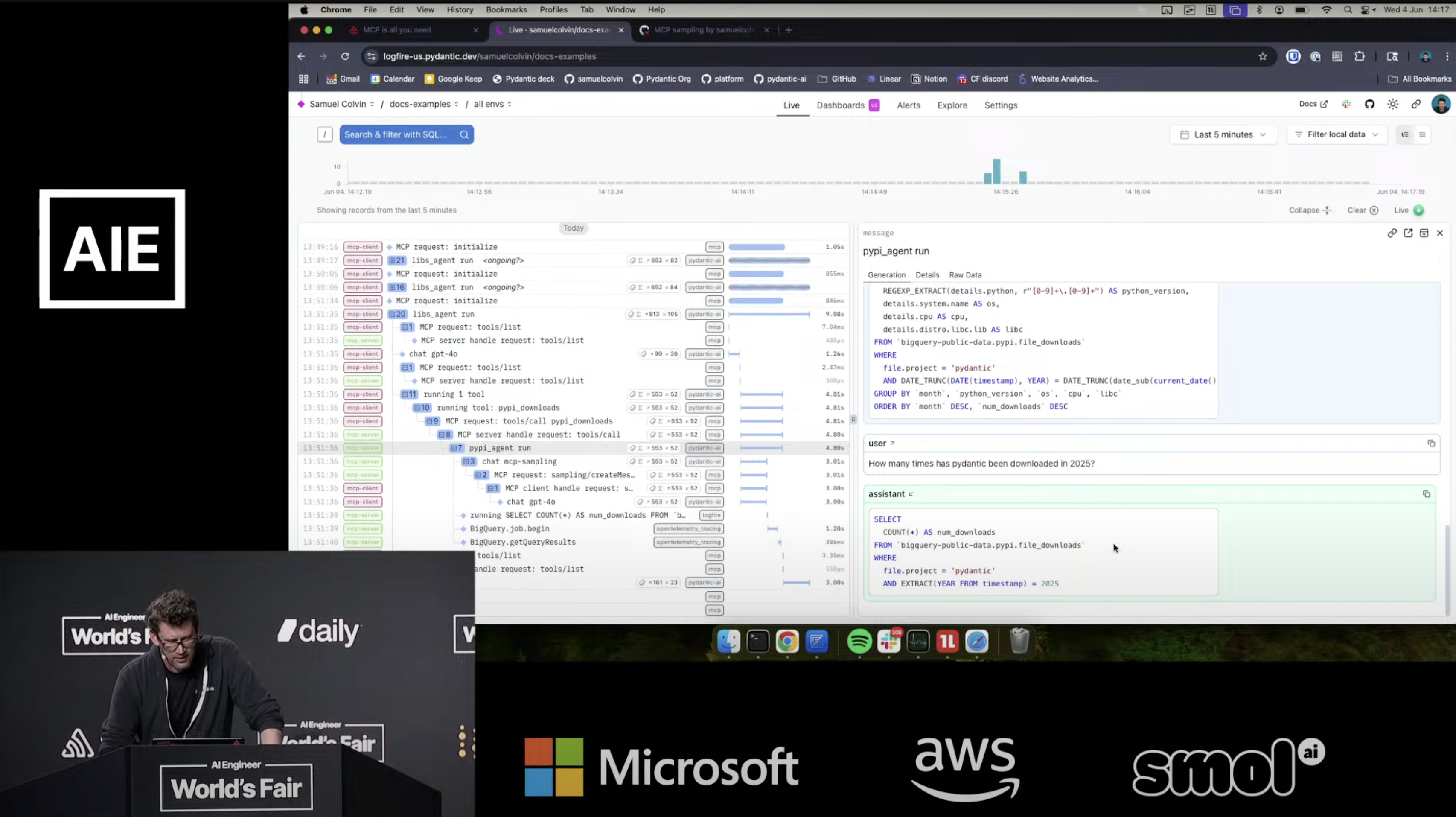 The title “MCP is all you need” plays off Jason Liu’s “Pydantic is all you need” talk from about two years ago, and follow-on talk from about a year ago, “Pydantic is still all you need.” Both talks have the same theme: you’re overcomplicating things, people! Colvin goes on to show is just how powerful MCP can be, in conjunction with Pydantic’s (also free open source) Pydantic AI package, along with Pydantic Logfire, their paid observability platform based on the OpenTelemetry standard. Colvin walks through all the code, and runs it, right there during his 20-minute talk, despite Wi-Fi troubles. Colvin explains why MCP’s tool calling capabilities are much more complex and powerful than you might at first imagine—dynamic tools, logging, sampling, etc. His explanation of the poorly-named and frequently-misunderstood sampling