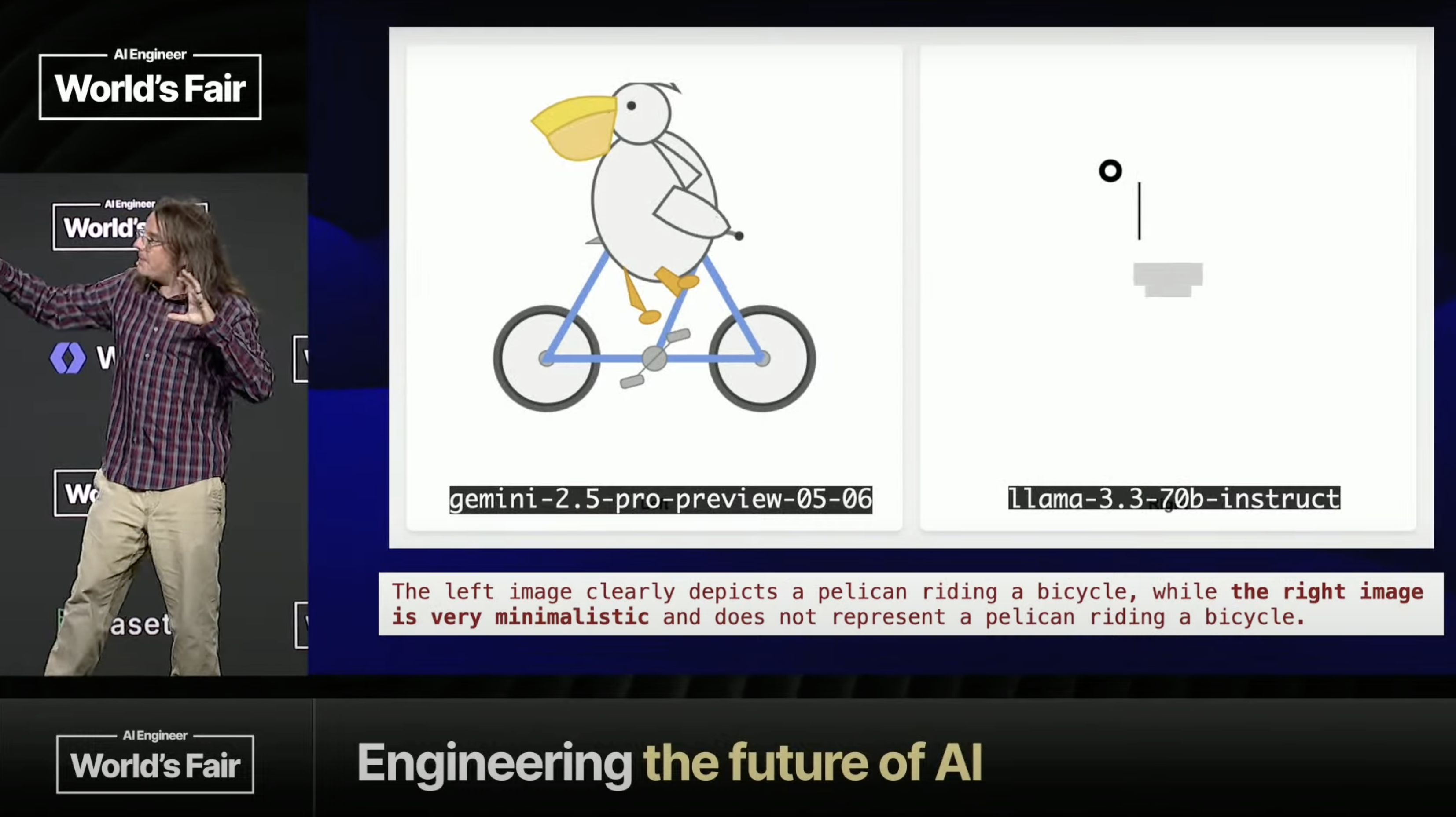 His “draw a pelican riding a bicycle” LLM benchmark is both hilarious and an uncannily accurate LLM quality assessment. At least until “the pelican test” starts to contaminate model training—I’m betting next year this benchmark may no longer yield valid results after Willison showed the Google Gemini 2.5 Pro pelican on a Google slide from the recent Google IO event …