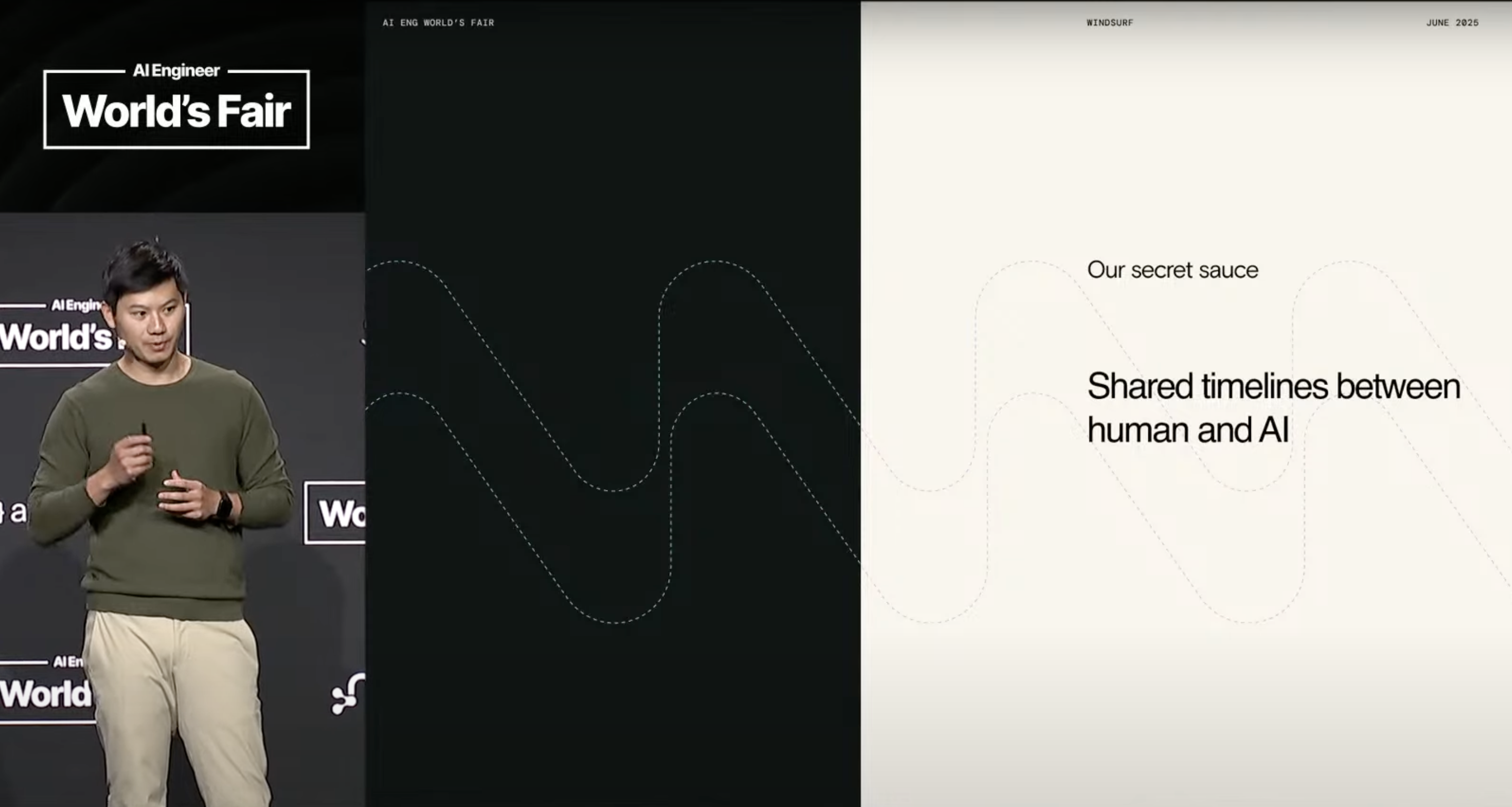 In the AI Coding space, IDE-tool subspace, my most-admired product, and also the one I have the most experience with, is Cursor. In my experience, which combines a lot of paying attention to what others think and a moderate degree of hands-on use, Cursor leads this sub-niche. The AIEWF2025 audience seemed to agree, when someone asked for raised hands for who uses Windsurf, and who uses Cursor. My estimate was about 5:1 Cursor:Windsurf. Having seen Kevin Hou’s session live, and re-watching it as I write this, I didn’t see anything to change my opinion. Hou claimed he was sharing Windsurf’s “secret sauce”—shared timelines between human and AI—but this and other points made in the sessions struck me as marketing points as opposed to actual breakthroughs. I didn’t see anything new; I just saw obvious points made as if I knew nothing about other tools or the current state-of-the-art in AI Coding.