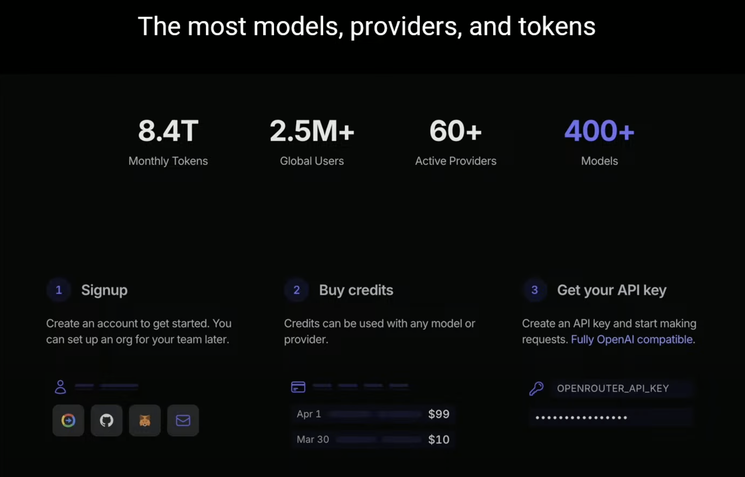 So what are the fundamentals of OpenRouter? API to access all language models; and also, because they are a marketplace, an unparalleled source of data about who is using what models. Pay in one place, with near zero switching cost. >400 models, >60 access providers, many payment methods including crypto.