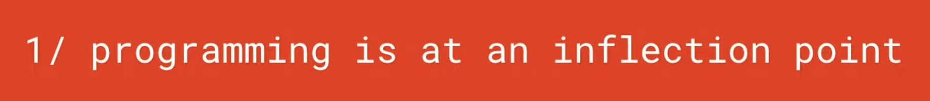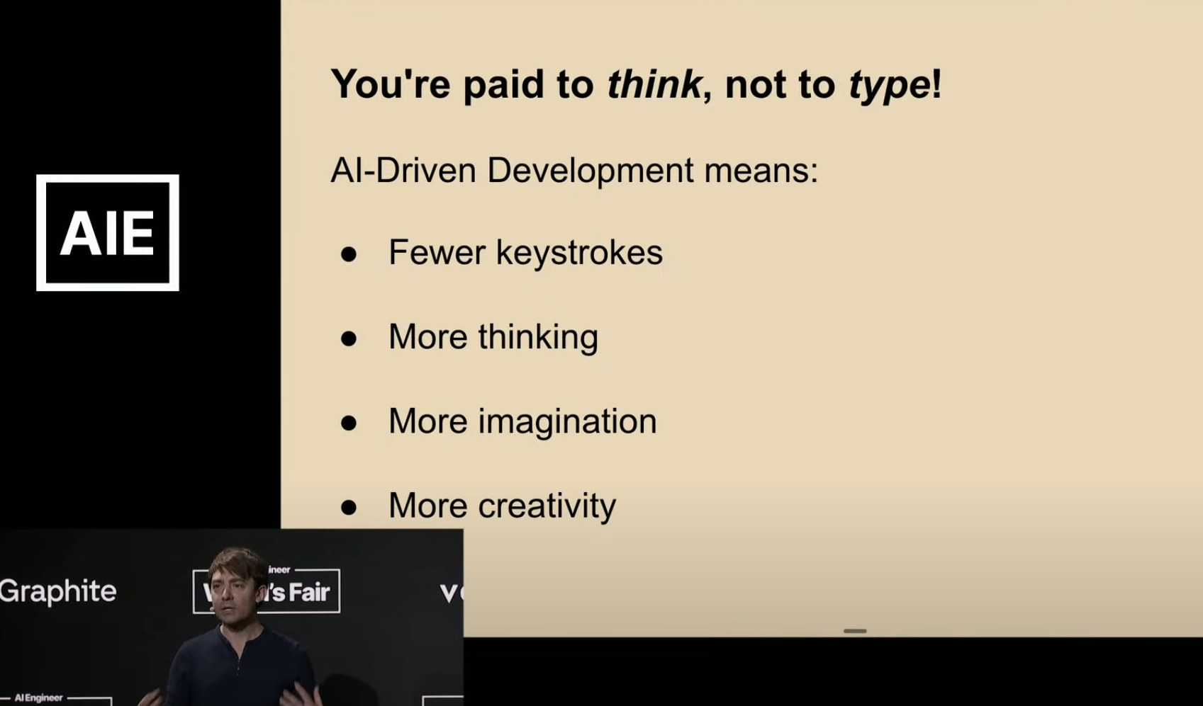 It seems like right now we’re still trying to find what that interaction pattern, what that future looks like. And a lot of what’s publicly available is more or less an incremental improvement. The current zeitgeist is to take tools that were developed 20 years ago for humans to write every individual line of code—tools that were designed first and foremost for human beings. And you sprinkle AI on top and then you keep adding layers of AI and then at some point maybe there’s some step function change that happens. But there’s not a lot of clarity there in exactly what that means.