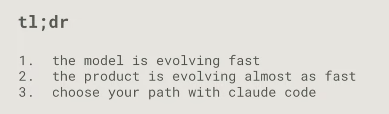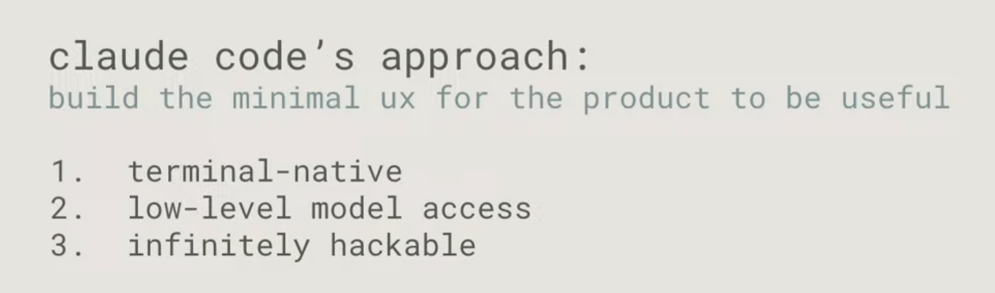 I feel like programming languages have sort of leveled out but the model is on an exponential and the UX of programming is also on an exponential … ide devx has evolved quickly, and will continue to change even more quickly … that. And so with all this in mind, Claude Code’s approach is a little different.
