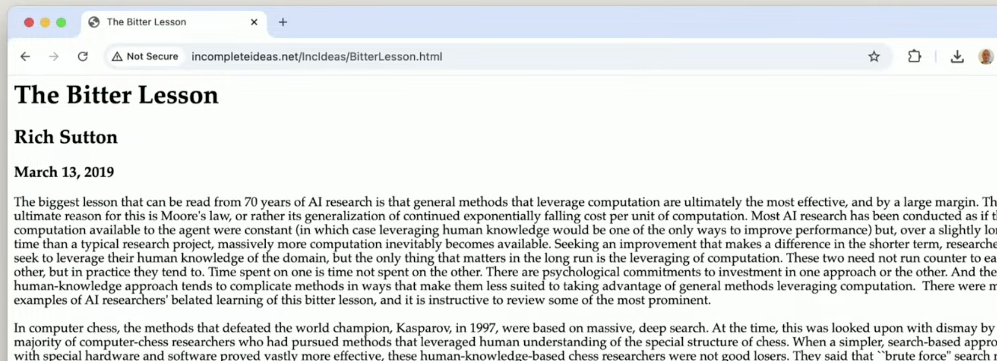 This is the bitter lesson. I have this like framed and taped to the side of my wall, because the more general model always wins and the model increases in capabilities exponentially and there are many corollaries to this. Everything around the model is also increasing exponentially and the more general thing even around the model usually wins.