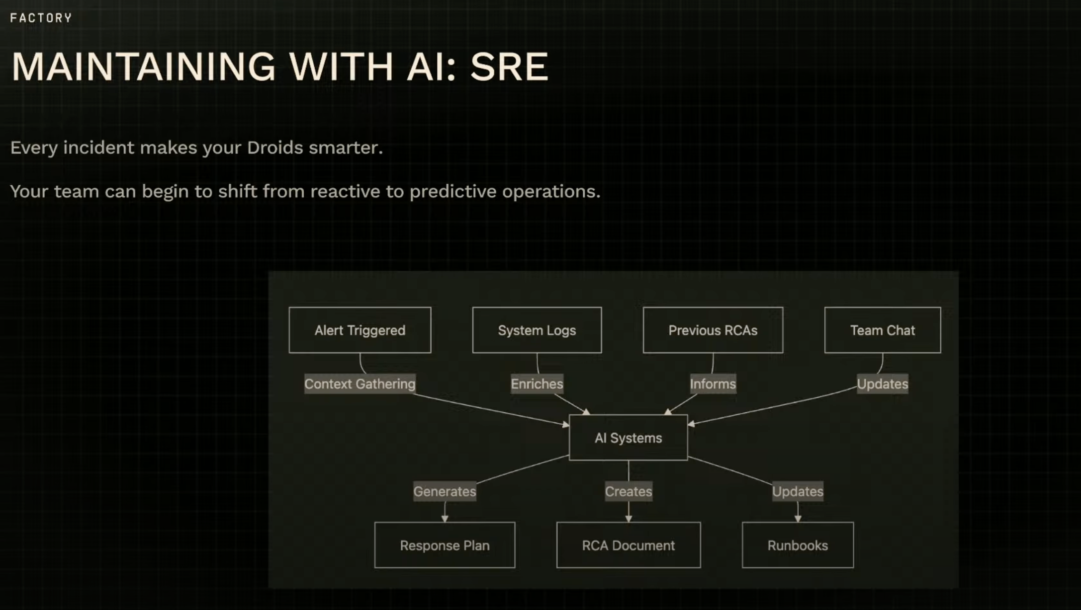 In the agile, human coding world that preceded AI coding, I have tended to streamline if not completely avoid what I saw as bloated processes based around heavyweight artifacts like Product Requirements Documents (PRDs). But in the new world, especially at F500 scale, it makes sense that we are coming full circle. Reyes moves on to a Site Reliability Engineering (SRE) example, show context and documents coming together in a loop where the system gets smarter and smarter, moving from helping to diagnose incidents to suggesting “I’m seeing a pattern here—why don’t we fix this.”