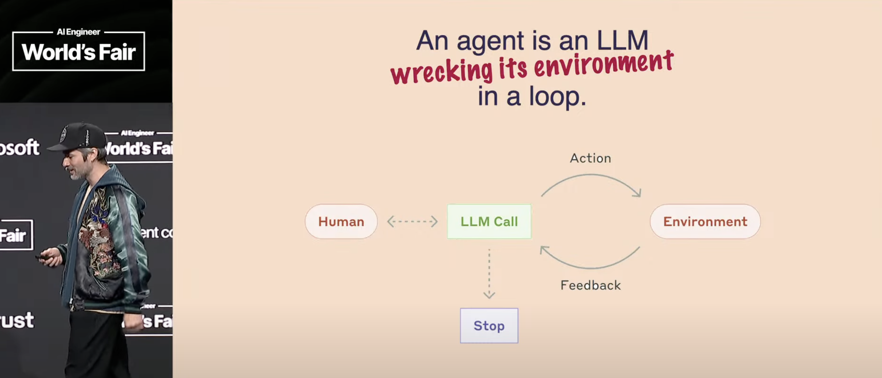 Hykes kicked things off with an adjustment to an Anthropic slide: An agent is an LLM wrecking its environment in a loop: