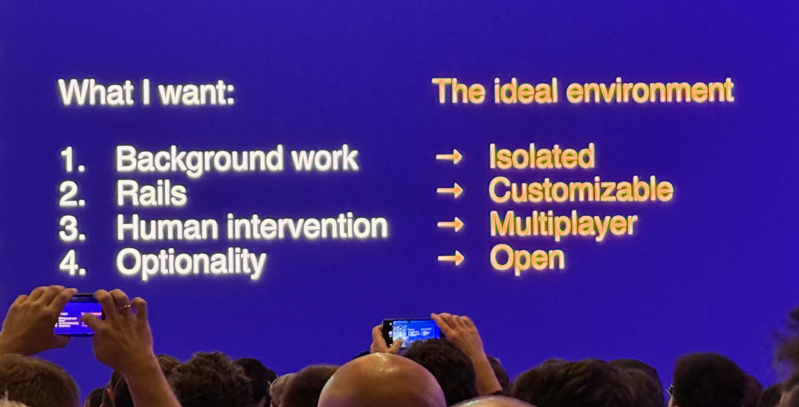 Against the advice of his team, Hykes launches into a wild and crazy live demo of (unfinished) Dagger, where he spawns about six Claude Code instances—and one Goose instance, just for fun—all iterating on a basic website project. Each instance–agent is iterating on the starting apps in complete isolation, with the orchestrating developer having the ability to merge any instance’s output if we like it. At the end, while the agents are madly spinning away, he open sources the Dagger project, live in front of the audience. I like Hykes, and I like Dagger—great stuff.