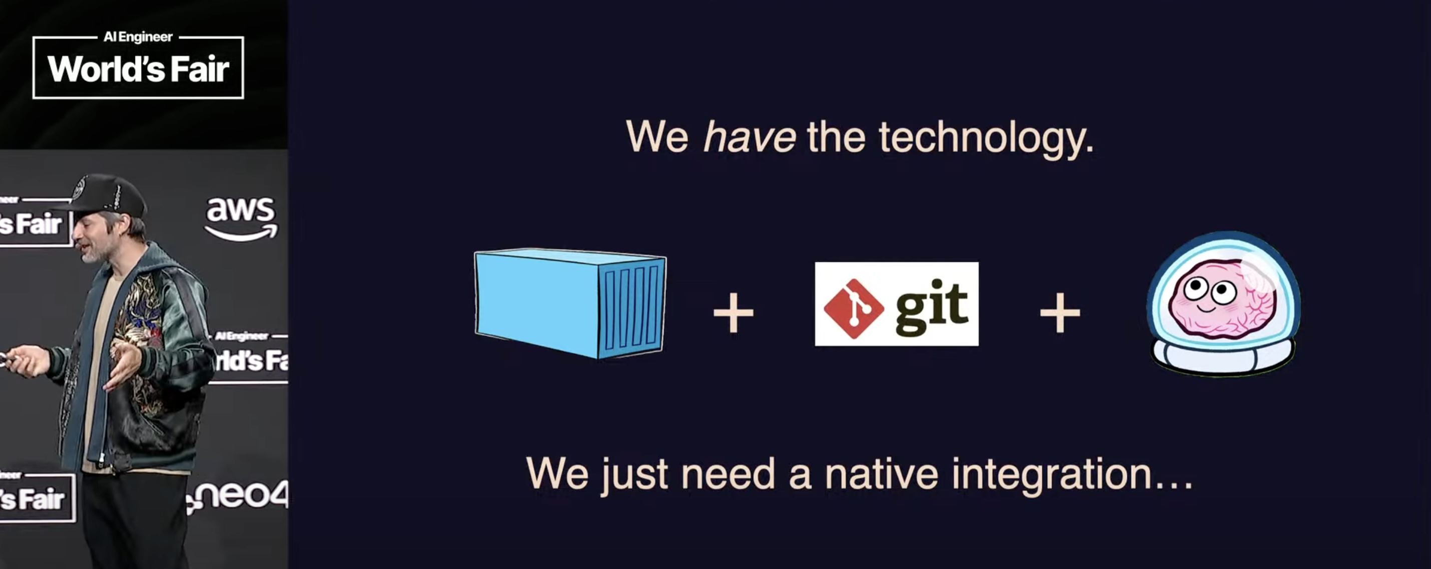 He points out that we already have the technology we need to deliver this: Containers + Git + Models, and mentions in passing that both containers and Git have a ton of capabilities that aren’t widely used by humans, but are perfect for agents. All we’re lacking is a native integration …