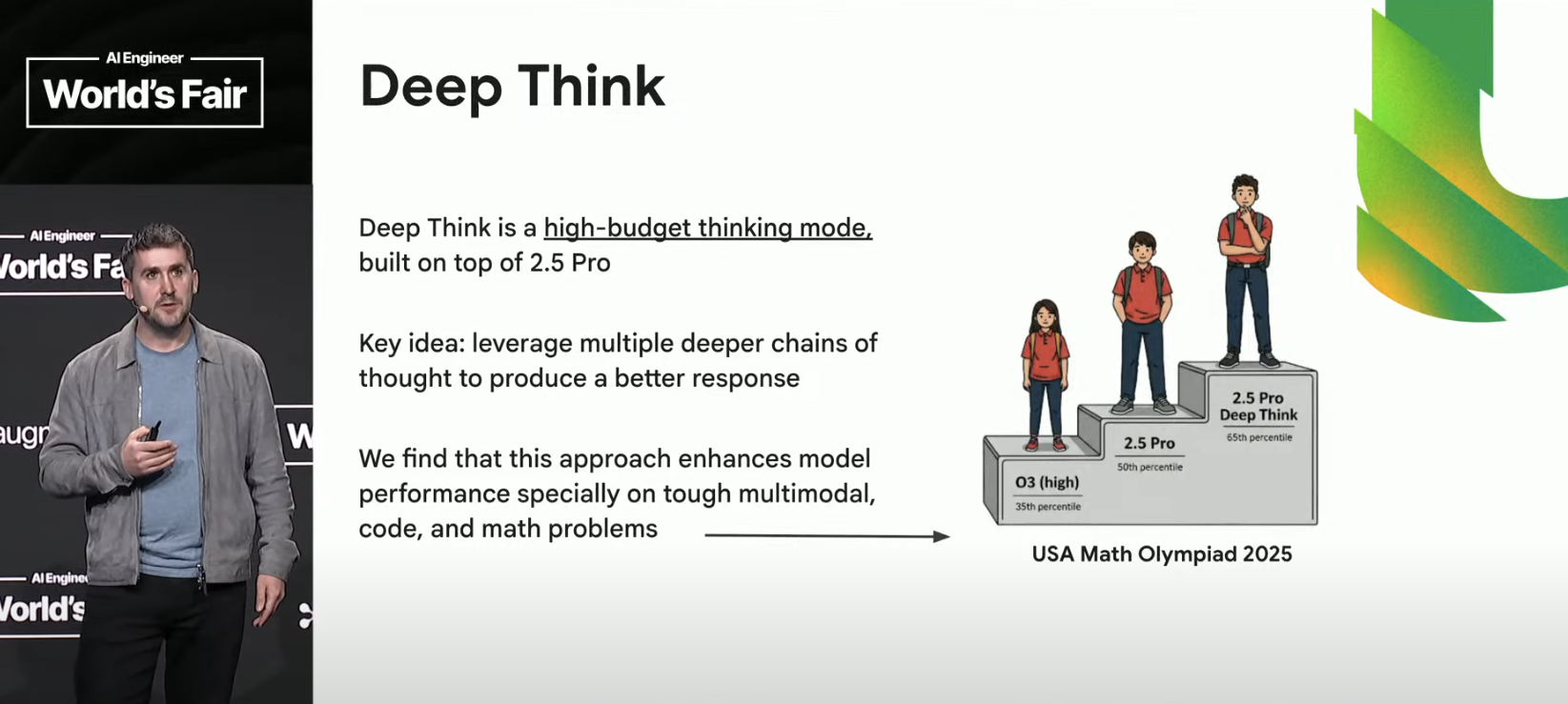 To close his keynote, Rae looks at what’s next—Deep Think, a high budget thinking mode for 2.5 Pro, which applies parallel, deeper chains of thought, yielding insane improvements on the toughest thinking challenges. Case in point: the 2025 Math Olympiad problem set, where OpenAI’s very good o3 reasoning model scored at the 35th percentile, 2.5 Pro reached 50th, and 2.5 Pro Deep Think all the way up to 65th percentile.