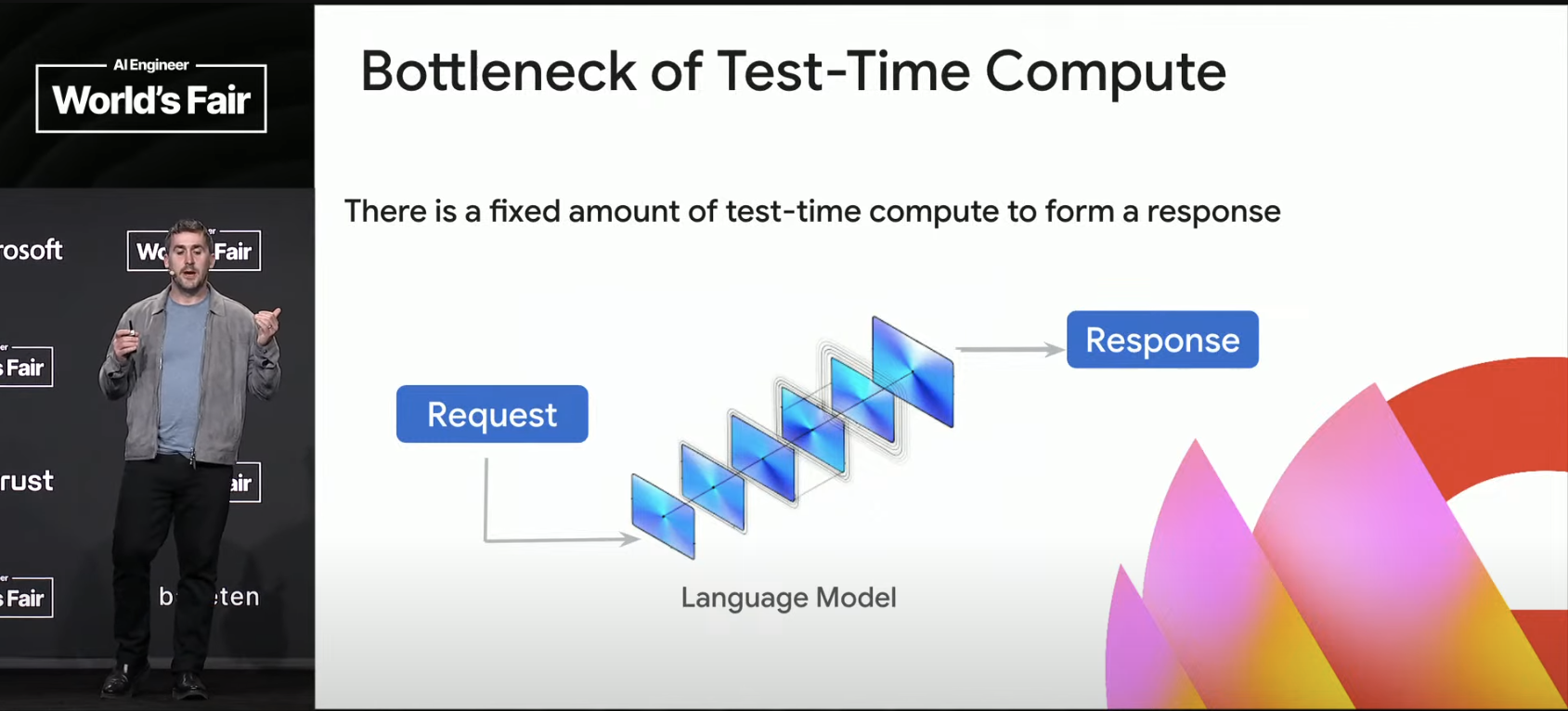 Traditional language models are trained to respond immediately to requests, meaning there is a constant, very limited amount of compute applied at test-time. It’s possible to increase TTC by using a larger model, but then all requests are forced to this fixed, larger amount of compute. Not a good scaling approach—much better is to train models that are designed to loop. Loop iteration scale is dynamic, so we can get orders of magnitude more TTC, with control over how hard the model “thinks.” (Later Rae mentions that “thinking budgets” are now part of the API in the Gemini Flash 2.5 and Pro 2.5 models. Developers get fine-grained control over how much TTC gets applied.)