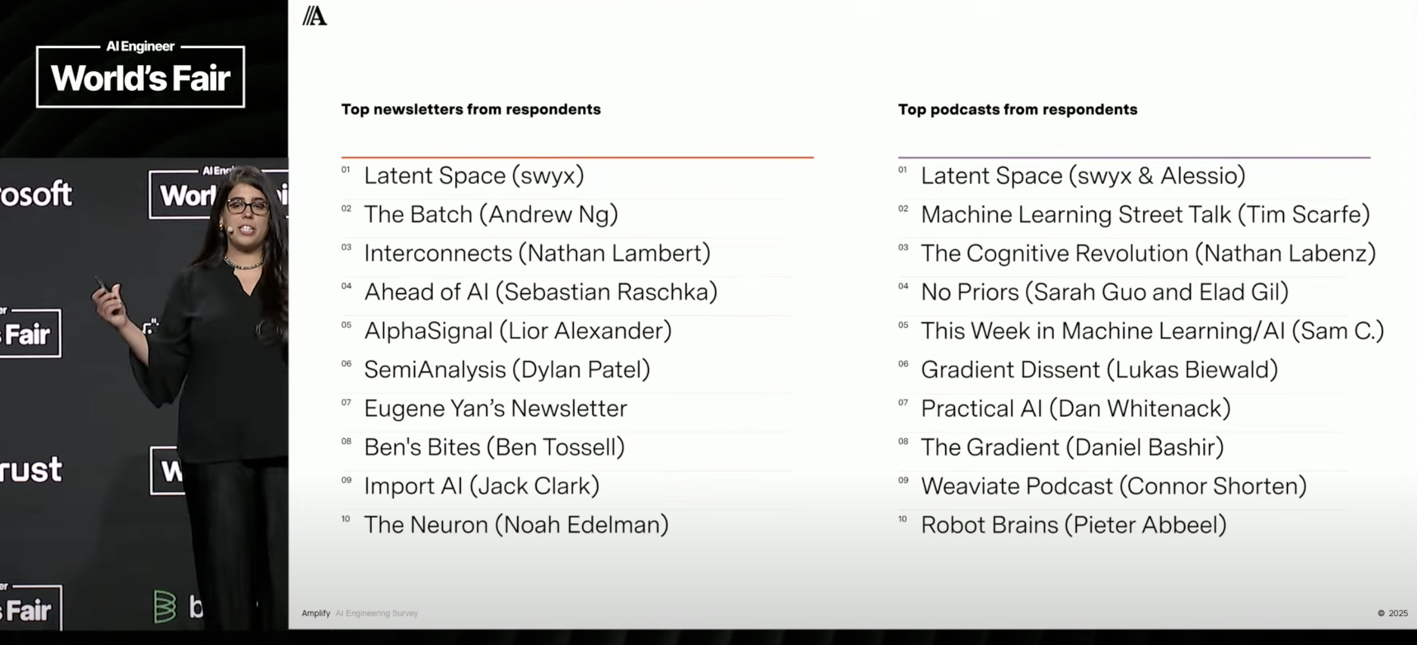 Amplify Partners recently completed their 2025 State of AI Engineering Survey, and partner Barr Yaron presented a number of early findings. Money slide for me: top newsletters and podcasts: