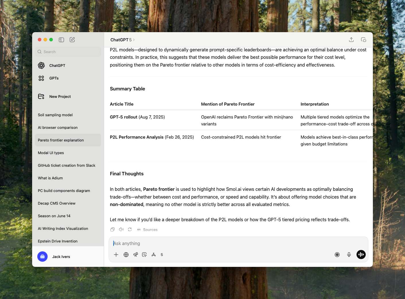 Over in ChatGPT, GPT-5 was able to ingest Claude Opus’s Artifact code, along with the chat transcript for context, and its first interactive canvas was already better than what Opus had produced in a couple of iterations—though GPT-5 had the benefit of Opus’s work. We thought we had the formula figured out, but then ran into problems when we tested the full range of possible inputs. GPT-5 impressed with highly creative—and ultimately successful—suggested solutions.