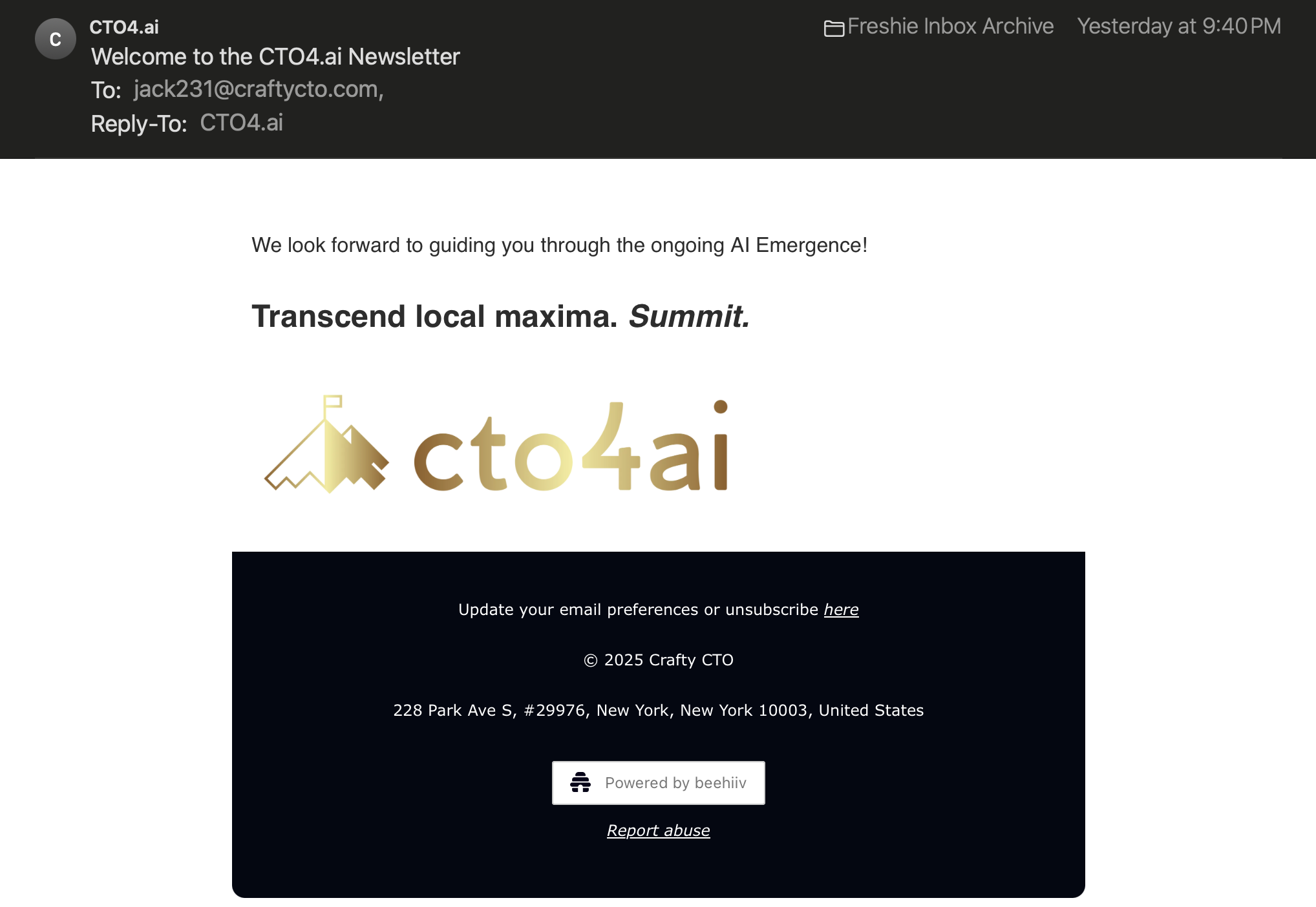 Anyway: you get the idea. This was a meaty piece of work, and I was doing it my spare hours around my fractional CTO day job. But 9 days after the repo came into being, cto4.ai launched, not just blog- but also newsletter-ready.