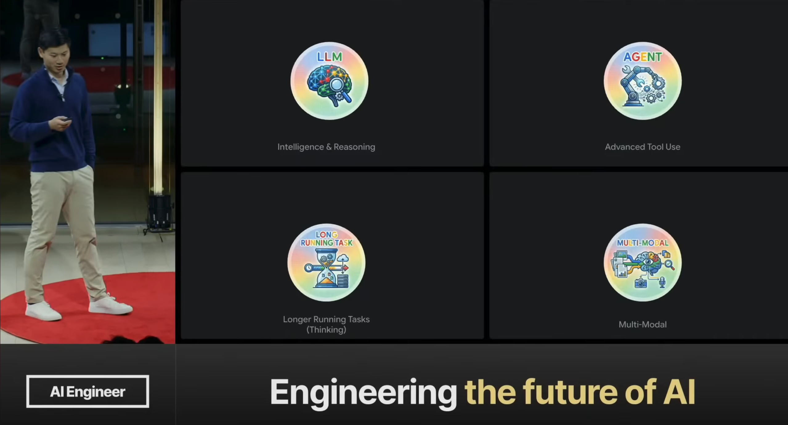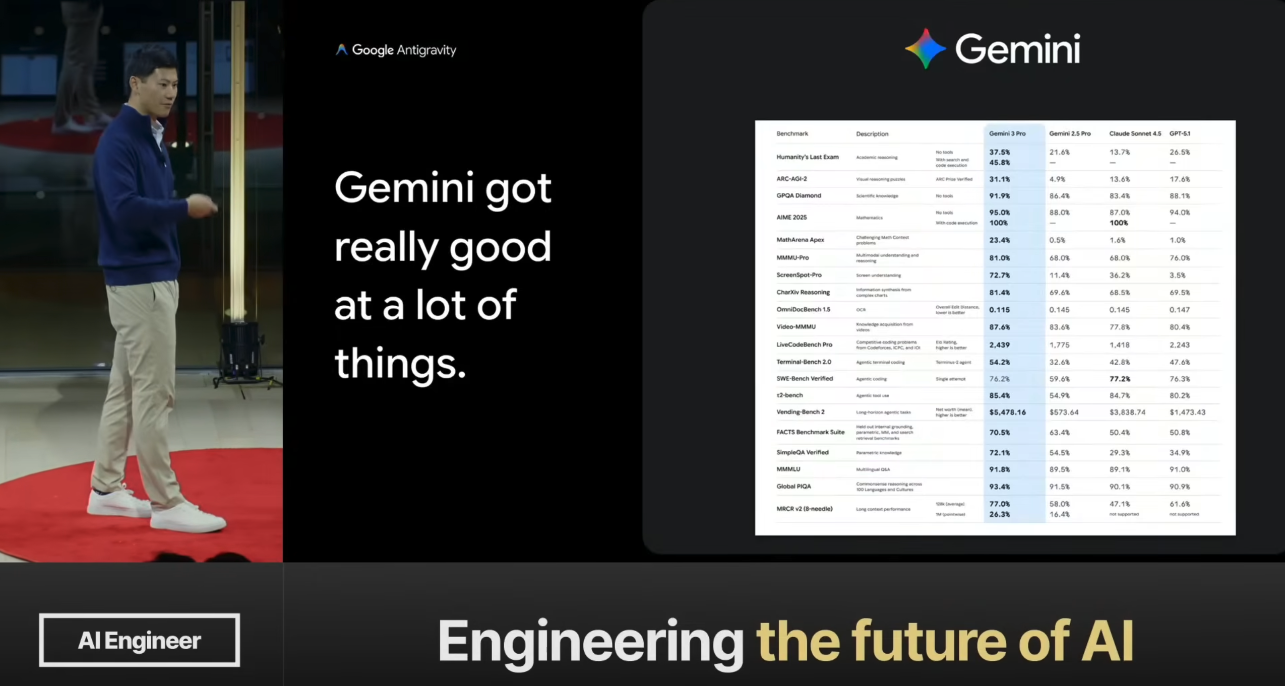 The whole reason why I’m not just standing up here and giving you this long stream of consciousness is because I have a PowerPoint. The PowerPoint is my Artifact. Gemini 3 is really strong with this sort of visual representation, it’s really strong with multimodal. So instead of showing this [left side], which of course we always show you, but we want to focus on this [right side]. And I think this is the game-changing part about Antigravity. And the theme is this dynamicism.