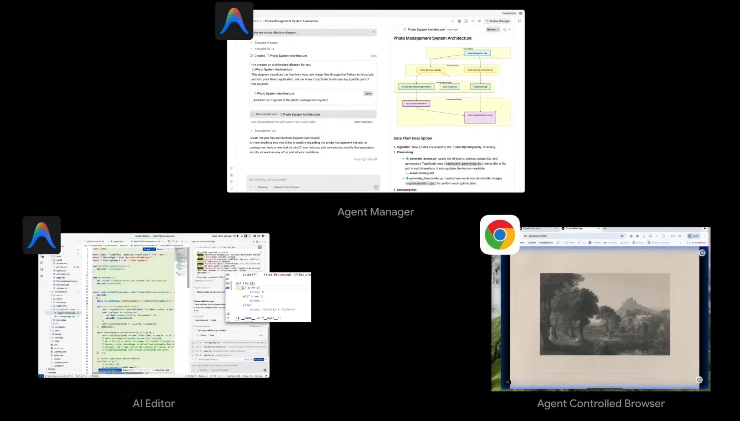 Now you have an AI editor. This is probably what you’ve grown to love and expect. It has all the bells and whistles that you would expect. Lightning fast, auto-complete. This is the part where you can make your memes about, yes, we forked VS Code. And it has an agent sidebar. And this is the sort of thing. It’s mirrored with the agent manager. And this is when you need to dive into your editor to accomplish maybe your 80% to 100% of your task. And at any point, we made it very, very easy because we recognized not everything can be done purely with an agent. For you to command E or control E and hop instantly from the editor into the agent manager and vice versa. And this takes under 100 milliseconds, it’s zippy.
