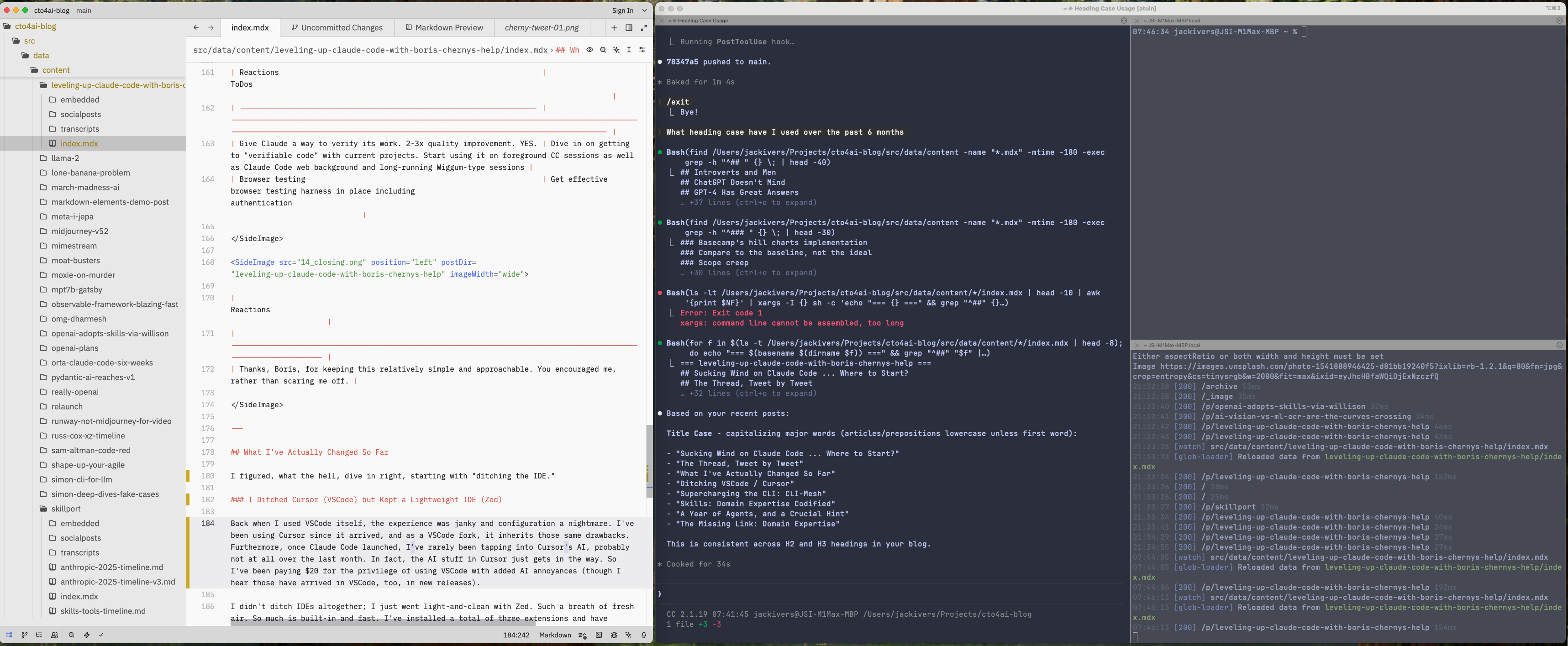 I chose not to ditch the IDE altogether, like Cherny apparently did. I still look at code regularly, and as I am now, I write in my IDE. No AI slop posts on cto4.ai. Instead, I went light-and-clean with Zed, which has been such a breath of fresh air after living in Electron apps for several years. So much is built-in and fast—I’ve installed a total of three extensions in Zed; I just checked and I had 48 installed in Cursor (!!). With just three extensions, Zed gives me a comparable feature set in a lighter, snappier, more coherent package.