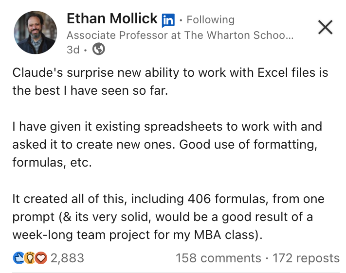 Ethan Mollick recently shared his experience working with Claude’s new Excel-spreadsheet-editing features: