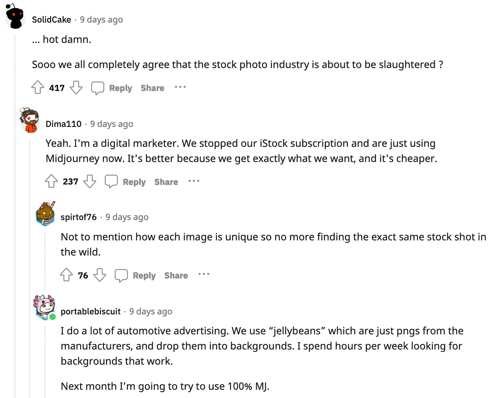 A case in point: you’re familiar with the stock photo business? Well, that industry has been terminated. On Reddit r/Midjourney, this post outlines how it’s now possible to use ChatGPT’s newest GPT-4 model to generate great Midjourney text prompts, which in turn renders jaw-dropping images. In the comments, several users immediately focus on the implications for the stock photo industry: